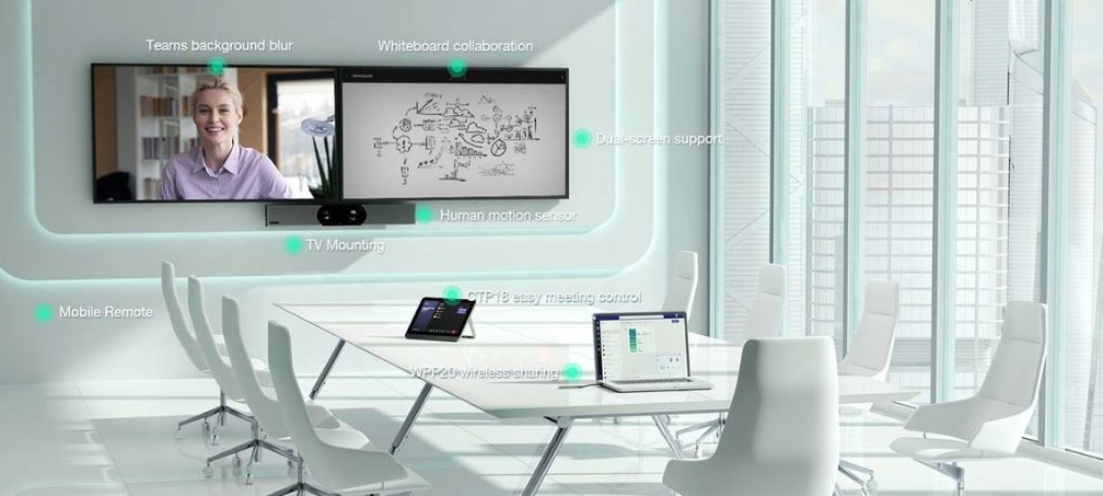 • Hệ thống camera kép: Bao gồm camera góc rộng 8 MP và camera tele 8 MP. Hỗ trợ auto-framing và speaker-tracking thông minh.