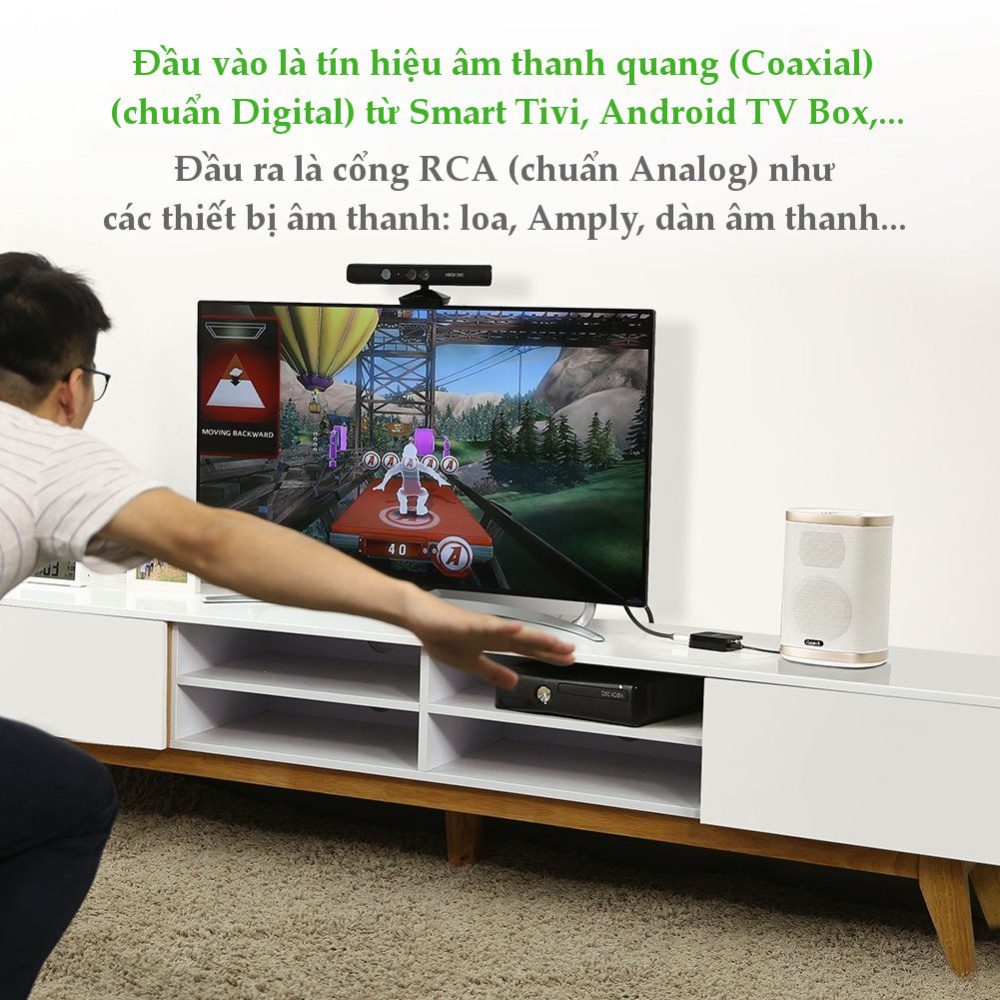 Bộ chuyển audio quang sang AV hay Coaxial sang RCA Ugreen 30523 là thiết bị chuyển đổi tín hiệu âm thanh số từ giao diện quang hoặc đồng trục sang tín hiệu âm thanh analog RCA, giúp kết nối các thiết bị số như TV và máy chơi game với loa hoặc tai nghe analog.