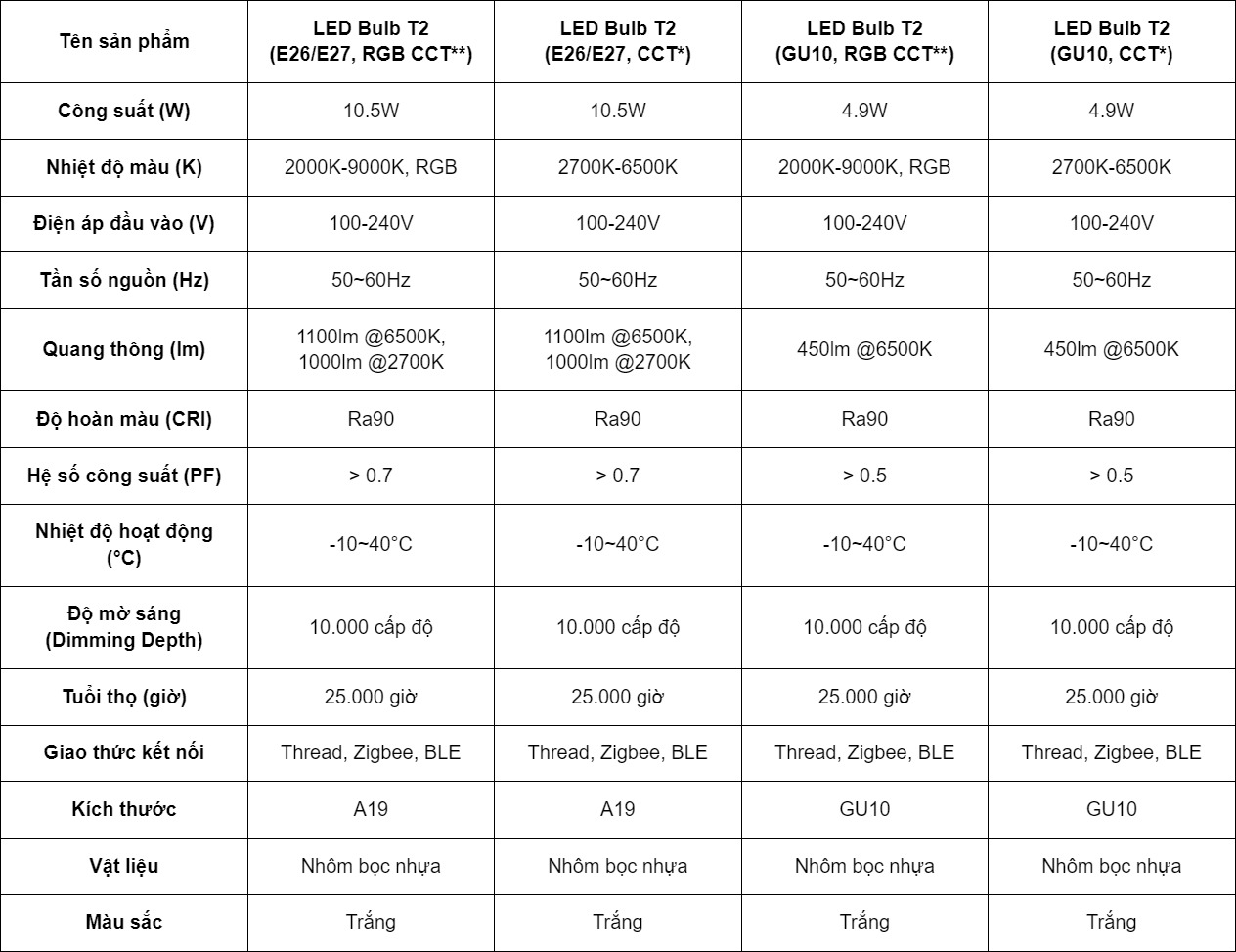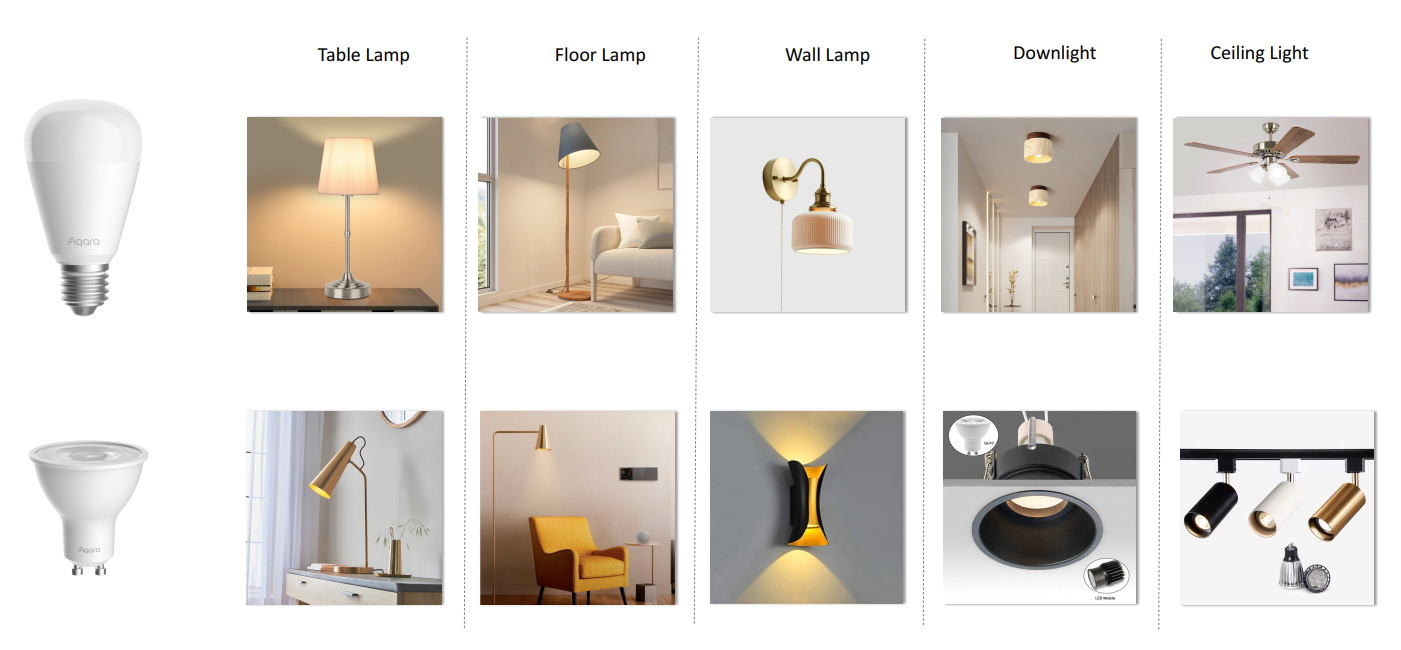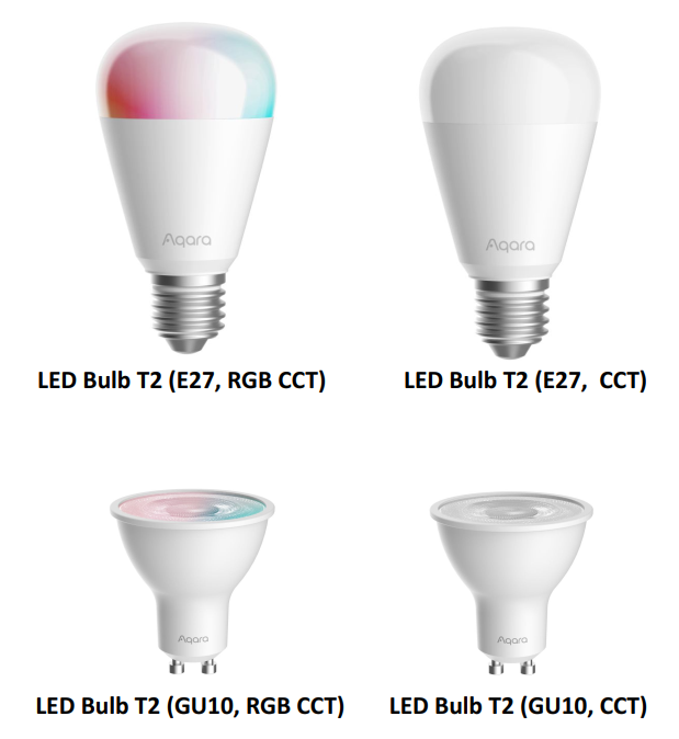 Bóng đèn Bulb Aqara T2 được thiết kế chui đèn E26 phù hợp các khu vực Châu Âu và E27 chuẩn đui đèn phổ biến tại khu vực Châu Á, dễ dàng thay thế cho các bóng đèn truyền thống. Bóng đèn LED T2 GU10 sử dụng loại đế gài được sử dụng trong một số mã đèn nhất định, thường thấy trong đèn huỳnh quang nhỏ gọn (CFL) và bóng đèn LED.