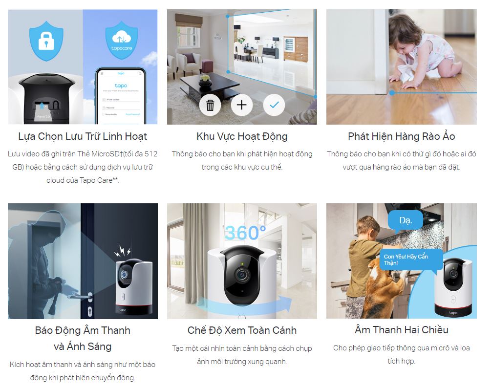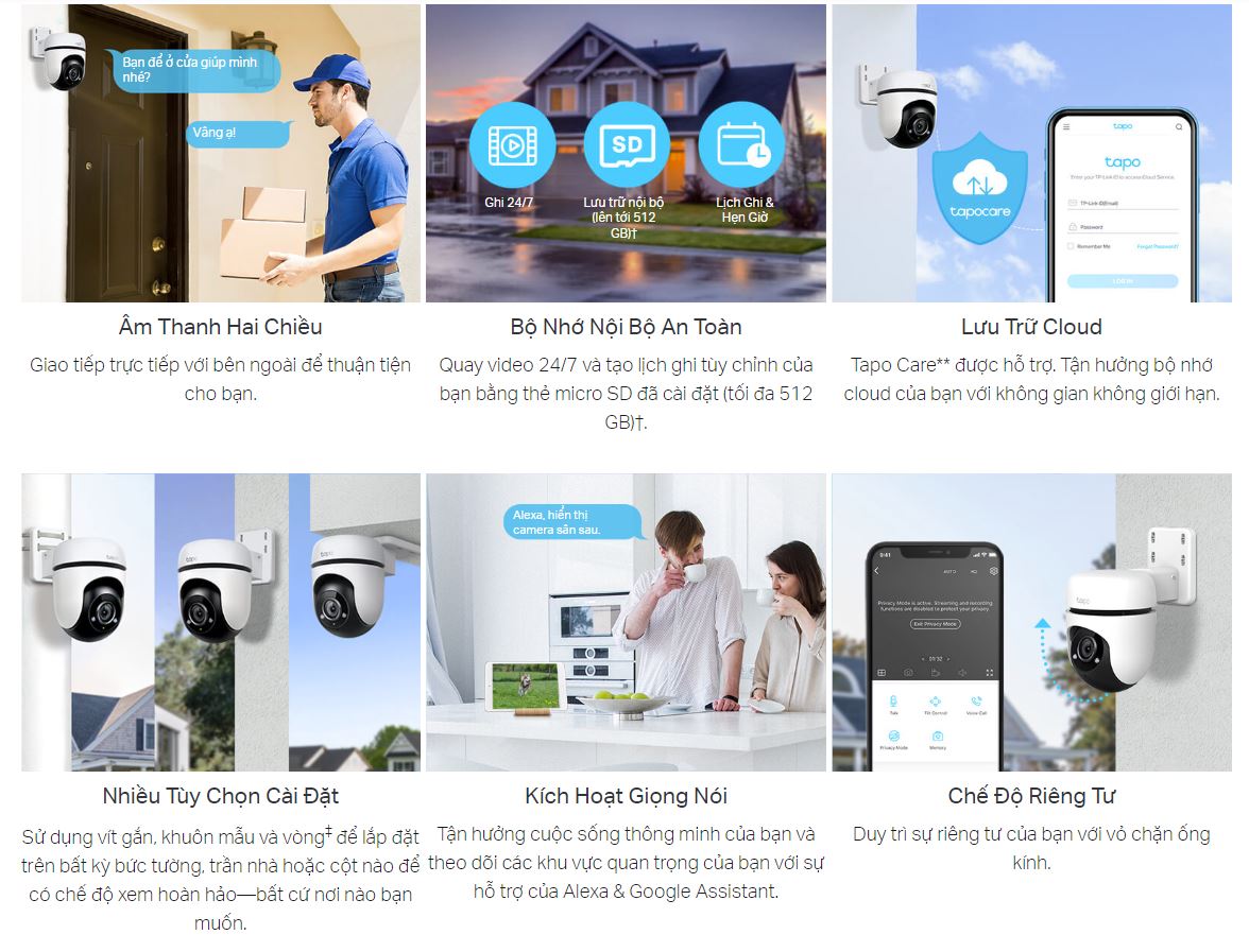| Tính năng | – Đàm thoại 2 chiều: Có – Điều khiển và xem trên điện thoại: Ứng dụng Tapo Camera – Lưu trữ: Micro SD 128GB |