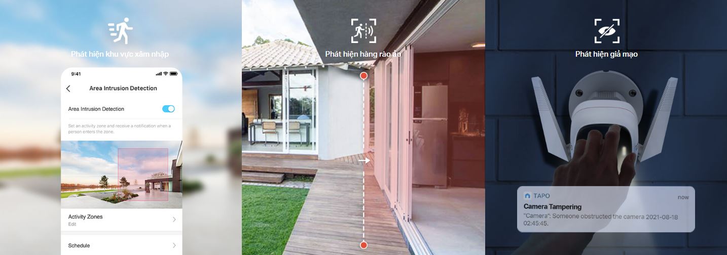 Đối với camera Tapo C320WS có chức năng phát hiện khu vực xâm nhập hoặc phát hiện được hàng rào ảo, phát hiện giả mạo. Tapo C320WS có thể tùy chỉnh được phát hiện các chuyển động nhanh chóng.