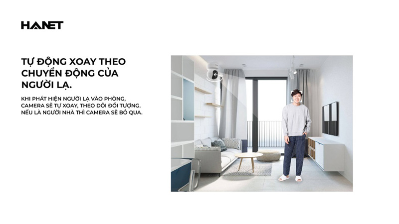 Ngay sau khi xác định đối tượng, camera sẽ thực hiện các bước kế tiếp. Nếu là người nhà, máy sẽ im lặng, quay trở về vị trí ban đầu. Trong trường hợp phát hiện người lạ, Hanet AI Cam Home sẽ phát ra âm cảnh báo, máy quay chuyển động linh hoạt, xoay theo hướng người đột nhập nhằm quay rõ mọi hành động. Sau khi liên tiếp phát chuông cảnh báo mà vẫn không thấy đối tượng rời khỏi, camera sẽ gọi điện cho chủ nhà.