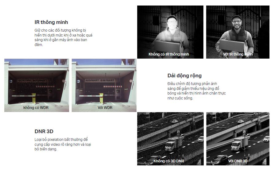 - Cải tiến video thông minh : Các công nghệ chuyên nghiệp của VIGI xử lý video để cải thiện đáng kể chất lượng của chúng, điều quan trọng đối với hoạt động giám sát của bạn, bao gồm Smart IR, WDR, 3D DNR và Night Vision.