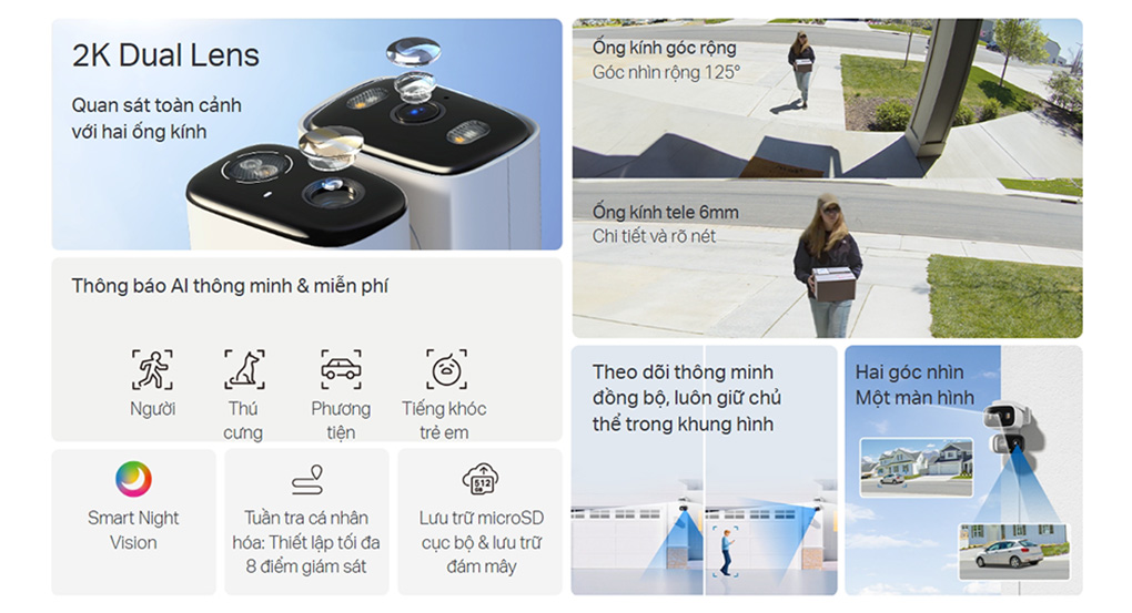 – AI phát hiện chuyển động, người, thú cưng, xe, tiếng khóc trẻ, vỡ kính, tiếng mèo, sủa chó, chống phá hoại.