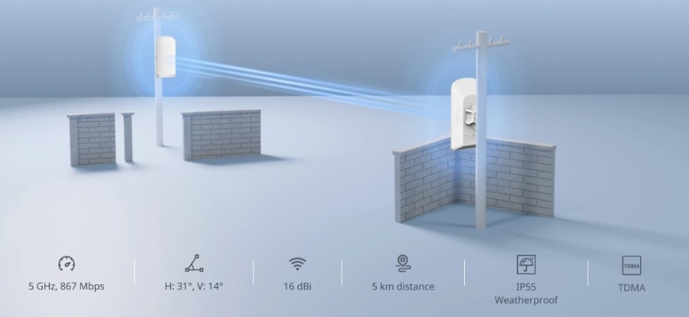 | Hỗ trợ | – Chuẩn Wi-Fi 5 – Tốc độ tối đa 867 Mbps – Xếp hạng chống chịu thời tiết: IP55 – Nhiệt độ hoạt động: –30°C to +65°C – 3 cổng 10/100/1000BASE-T – Độ lợi ăng-ten: 16 dBi – Góc ngang: 31°, góc dọc: 14° – Khoảng cách đề xuất: 5 km – Ghép nối PTP tự động – Ghép nối một chạm cho chế độ PTMP – Hỗ trợ TDMA – Hỗ trợ SON |