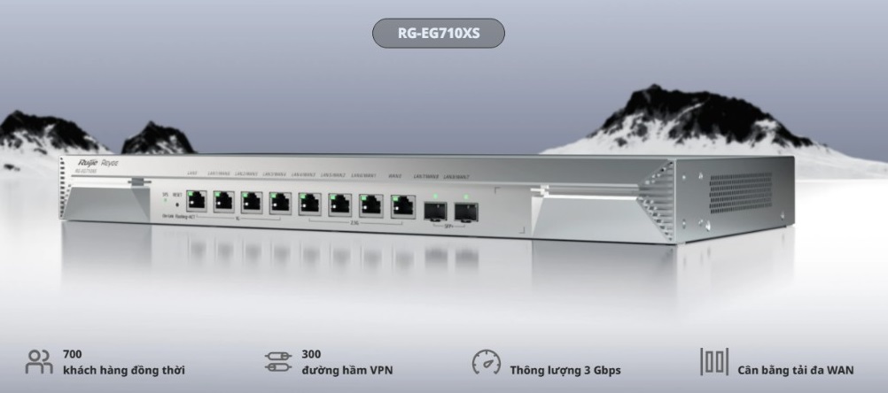 | Hỗ trợ | – 1 cổng WAN cố định, 1 cổng LAN cố định, 8 cổng có thể chuyển đổi LAN/WAN – 4 cổng 10/100/1000BASE-T – 4 cổng 10/100/1000/2500BASE-T – 2 cổng 10GE SFP+ – Băng thông: 3000 Mbps – Số người dùng đồng thời: 700 – CPU 4 core 1.8GHz | RAM: 2GB | Flash: 256MB – Công suất tiêu thụ: 14 W – Hỗ trợ bắt rack 1U – Hiệu năng cao hỗ trợ lên đến 700 người dùng đồng thời – Thông lượng 3 Gbps, bộ định tuyến hiệu năng cao cho mạng văn phòng – Hỗ trợ lên đến 300 tunnels VPN cho chi nhánh và nhân viên từ xa – Quản lý băng thông hiệu quả dựa trên ứng dụng và người dùng – Cân bằng tải thông minh giữa nhiều đường truyền – Quản lý trọn đời trên Ruijie Cloud |