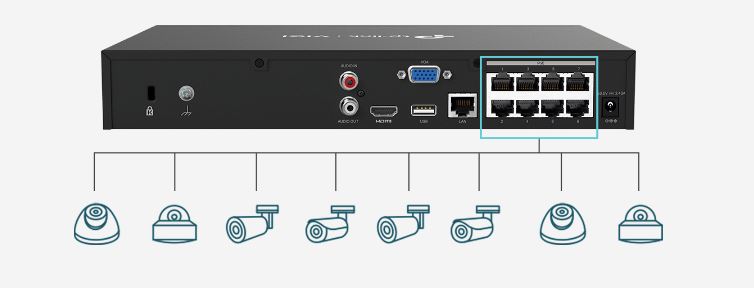Với đầu thu TP-Link VIGI NVR1008H-8MP được trang bị 8 cổng 10/100Mbps PoE+ hỗ trợ tối đa 30W trên mỗi cổng. Ngoài ra, đầu thu TP-Link VIGI NVR1008H-8MP được thiết kế để sử dụng một cáp Ethernet truyền dữ liệu và điện năng cung cấp khả năng lắp đặt linh hoạt phù hợp giám sát khác nhau.