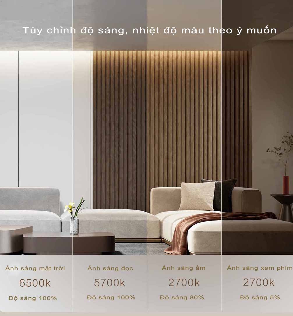 Nhiệt độ màu của đèn có thể điều chỉnh trong khoảng 2700K-6500K từ ánh sáng ấm đến ánh sáng trắng lạnh, đáp ứng với mọi nhu cầu sử dụng và từng không gian khác nhau.