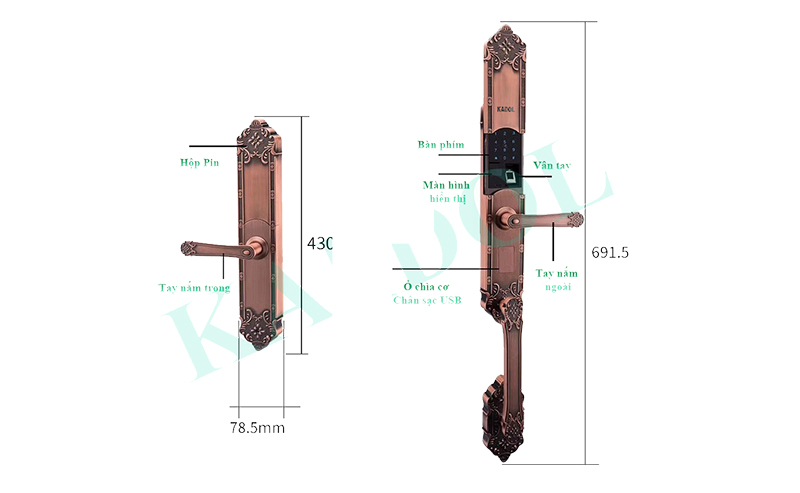 Khóa cửa vân tay biệt thự Kadol KD-VL-8000 là siêu phẩm dành cho cửa Biệt thự, mang theo cả châu Âu cổ điển về ngôi nhà của bạn. Việc chọn lựa bộ khóa vân tay cổ điển, mà vẫn đảm bảo chất lượng là điều mà ai cũng quan tâm khi chọn lựa thiết bị gia dụng cho ngôi nhà của mình. Điểm nổi bật đầu tiên khi nhìn vào model Kadol KD-VL8000 là thiết kế sang trọng, tinh tế. Điều này được thể hiện qua những chi tiết, hoa văn phong cách đậm chất cổ điển.