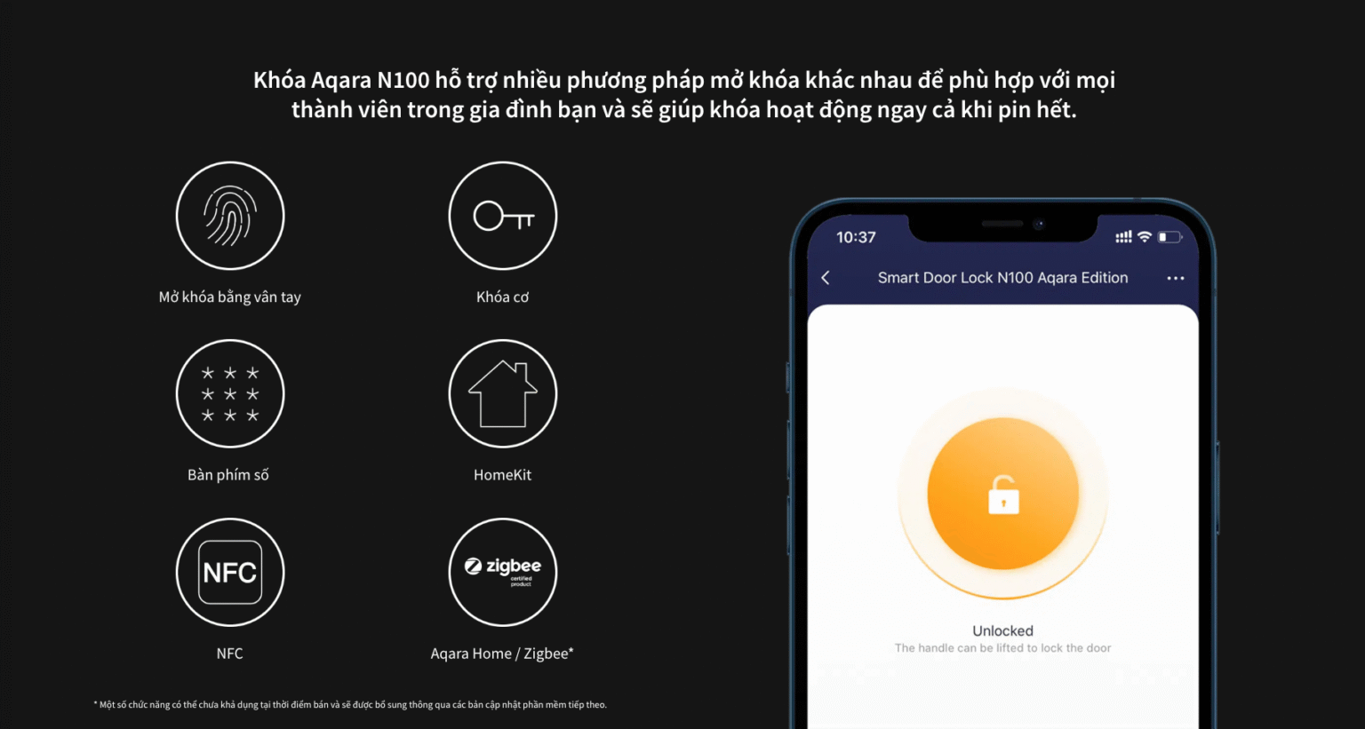 Một trong những ưu điểm nổi bật của khóa thông minh Aqara N100 là hỗ trợ nhiều phương thức mở khóa khác nhau, đáp ứng nhu cầu sử dụng của mọi đối tượng trong gia đình.